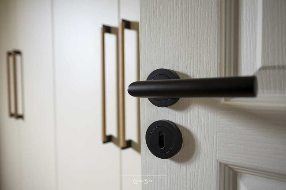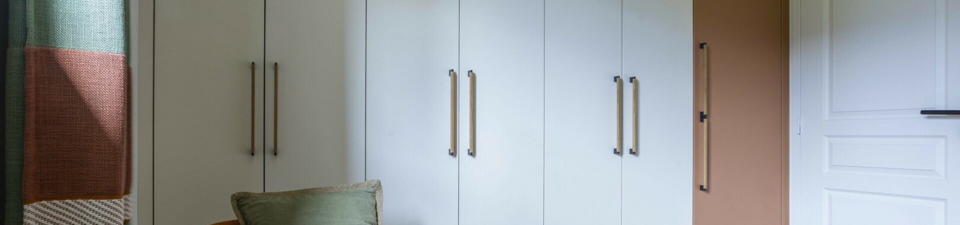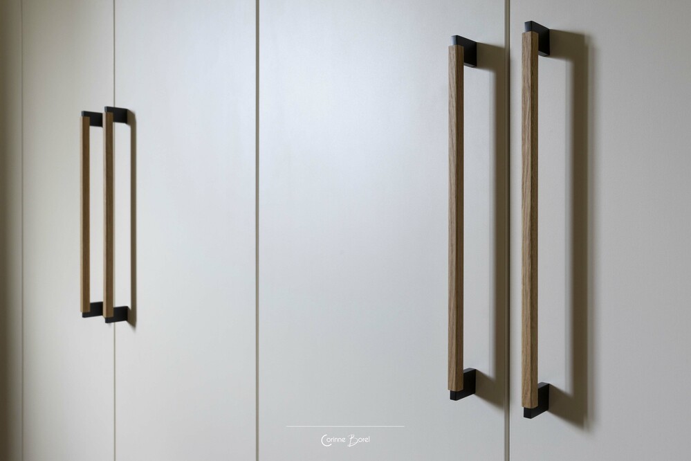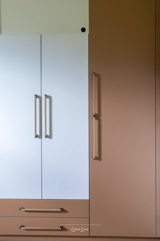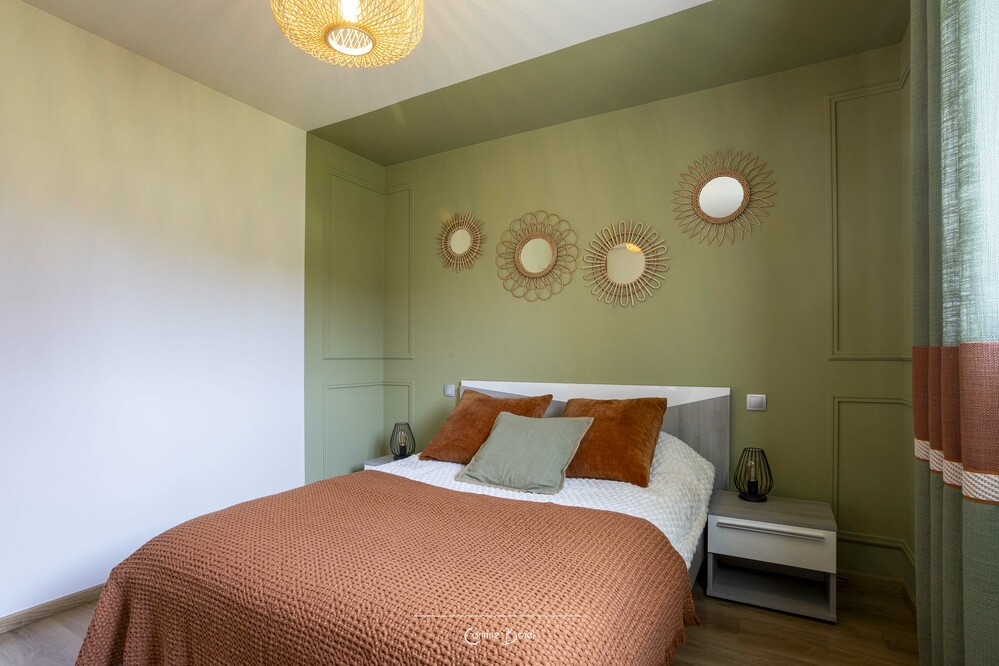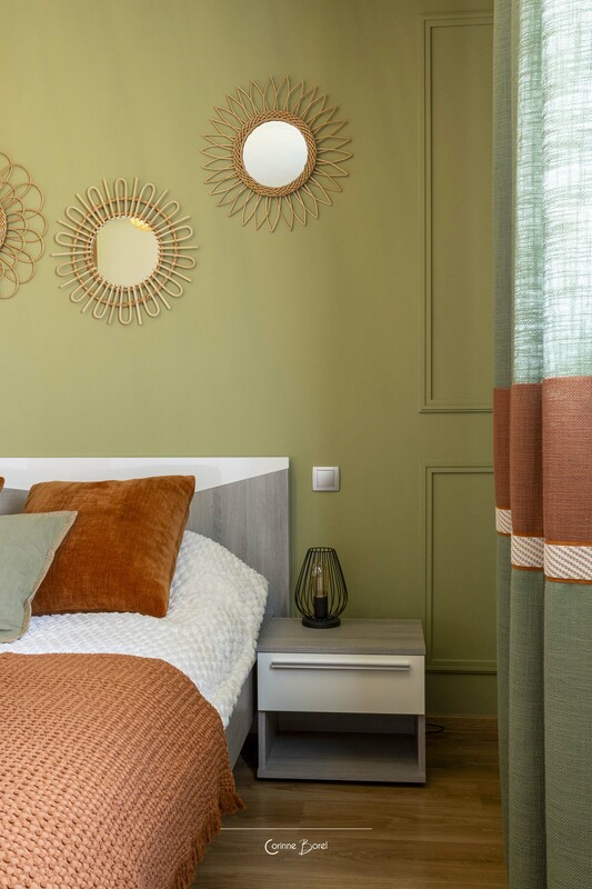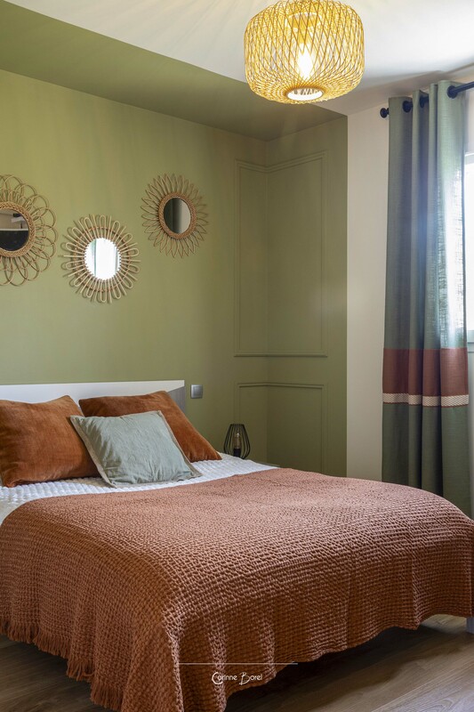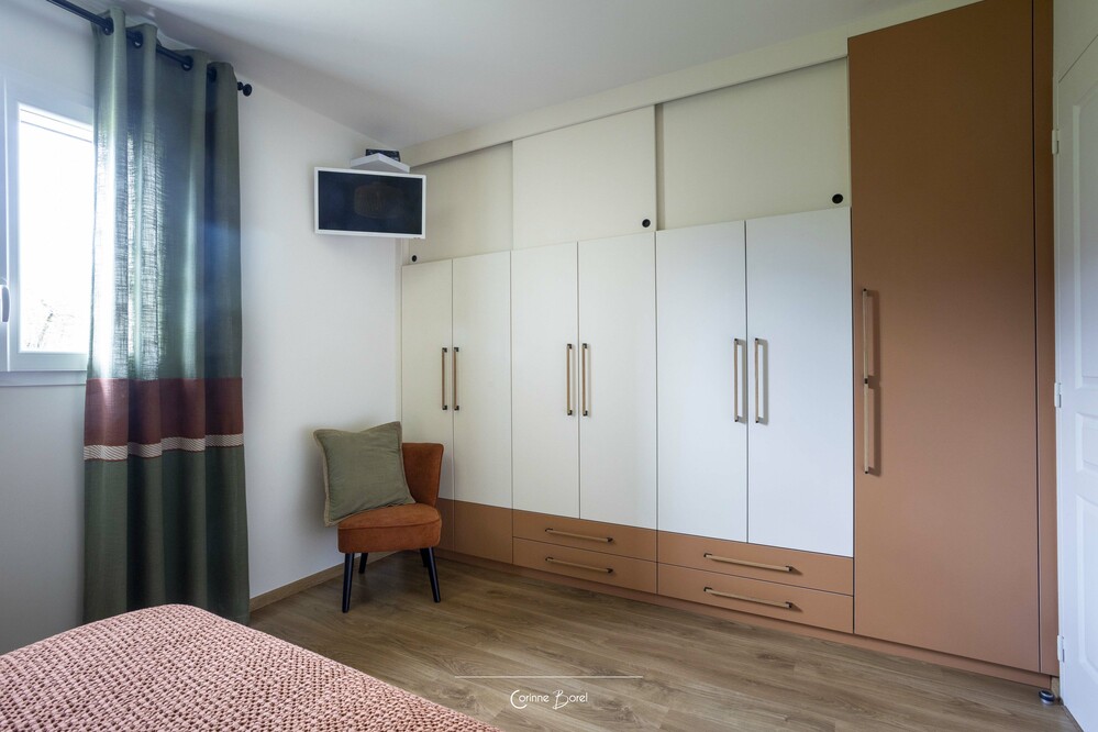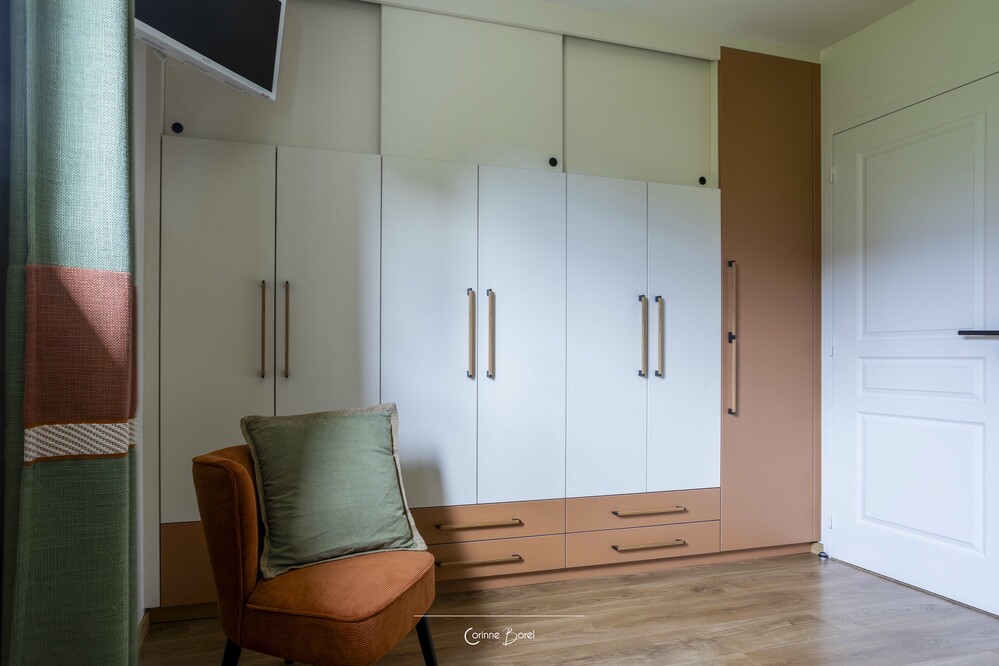 Réaménagement d'une pièce de vie Ce projet de rénovation met en valeur une chambre parentale entièrement repensée, où chaque élément a été conçu pour créer une atmosphère douce, élégante et fonctionnelle. La tête de lit structure l’espace grâce à un travail de moulures, souligné par un encadrement vert qui se prolonge du mur au plafond. Ce traitement graphique apporte profondeur et caractère, tout en délimitant visuellement l’espace nuit. Un dressing sur mesure a été entièrement imaginé et dessiné par l’agence. Le jeu subtil des façades, associé à l’intégration soignée des poignées, offre un ensemble à la fois esthétique, épuré et parfaitement fonctionnel. Les rideaux, confectionnés sur mesure, participent à l’harmonie générale du projet. Ils assurent une continuité visuelle avec les teintes de la pièce et renforcent l’équilibre entre les matières et les couleurs. Un projet d’architecture intérieure sur mesure, alliant optimisation des rangements, cohérence esthétique et mise en valeur des volumes. Peinture : FOUR Sébastien Photographe : Pascale Poujols |