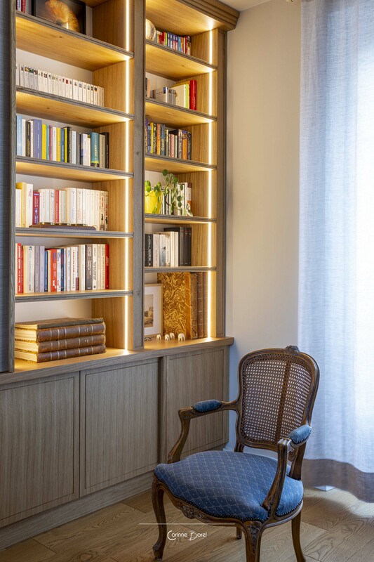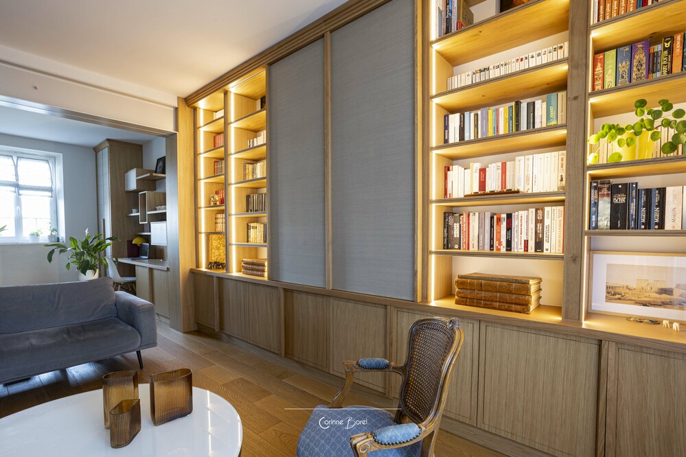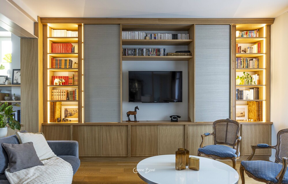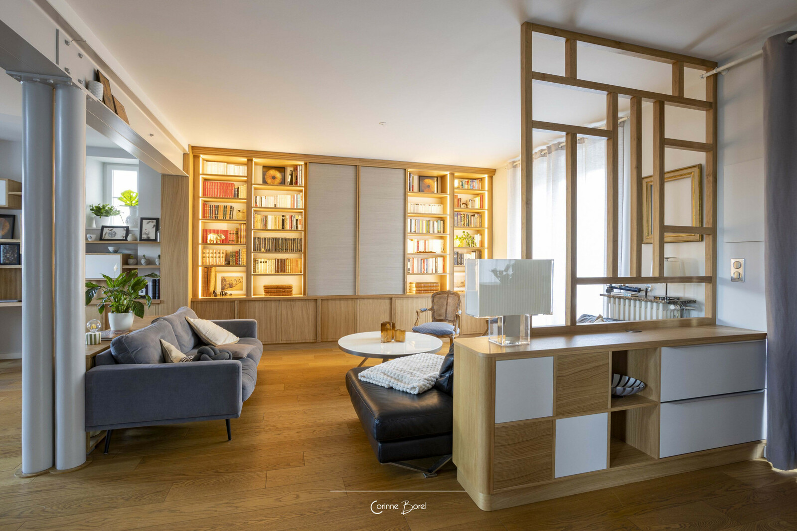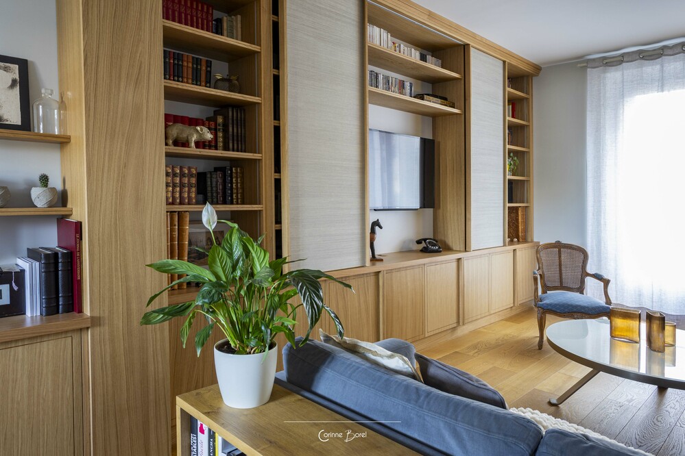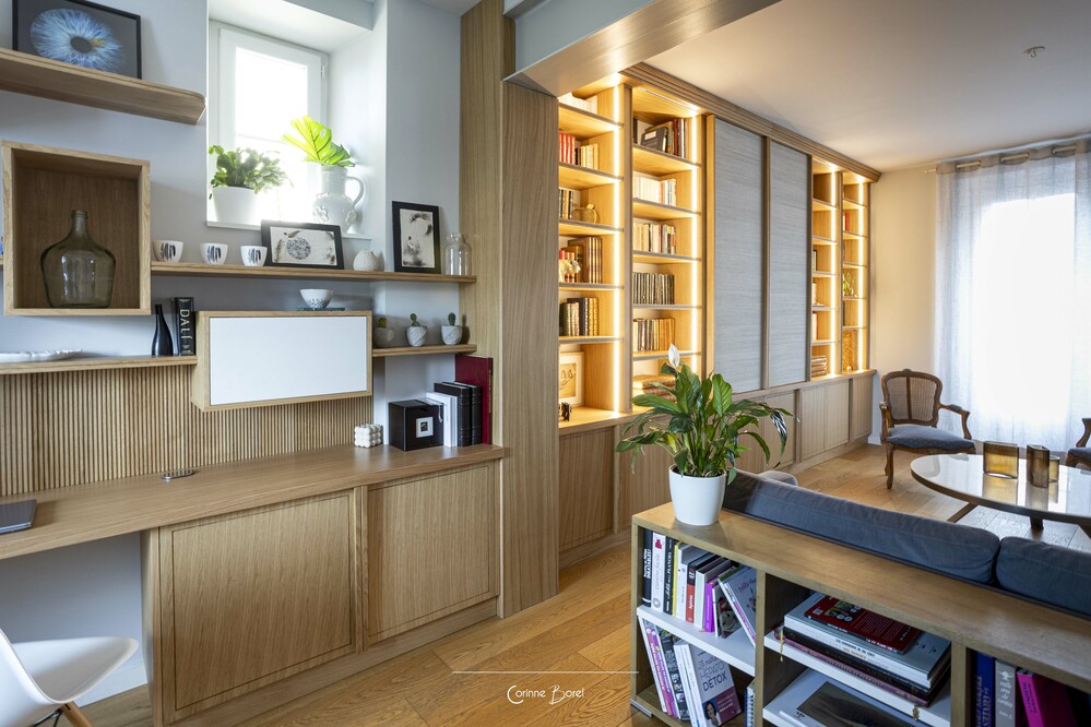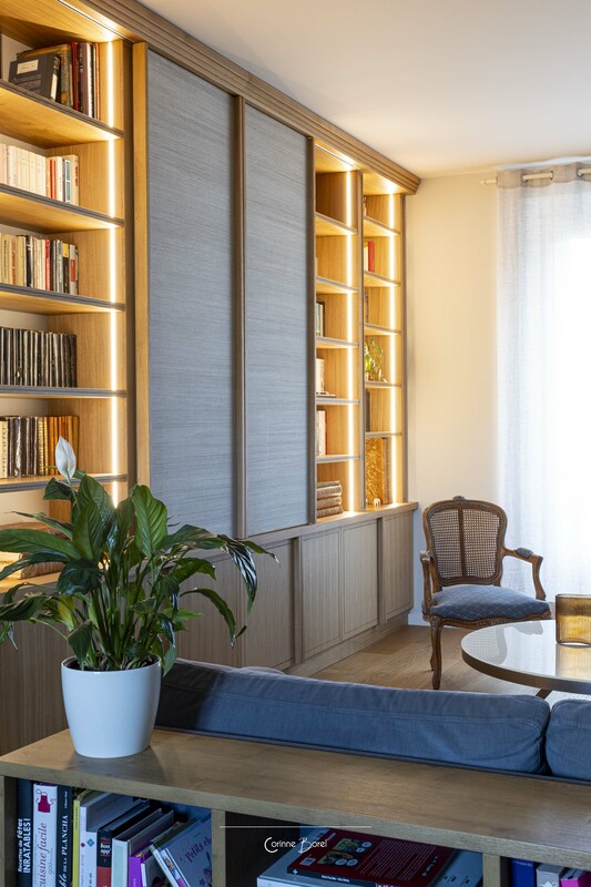 Réaménagement d'une pièce de vie Dans ce projet, les clients nous ont sollicités afin de structurer une grande pièce de vie ouverte, dépourvue de zones clairement définies. Leur souhait était d’intégrer des agencements sur mesure qui s’inscrivent naturellement dans l’architecture existante, comme s’ils faisaient partie intégrante des murs. Nous avons ainsi conçu une bibliothèque sur mesure, pensée comme un élément architectural à part entière. Dotée de portes coulissantes, elle permet de dissimuler la télévision tout en conservant une esthétique épurée et élégante. L’utilisation du chêne massif vient renforcer le caractère authentique et intemporel de l’ensemble. L’agencement TV se prolonge le long du mur afin de créer une continuité visuelle et fonctionnelle, donnant naissance à un espace bureau intégré. À l’entrée, deux agencements distincts viennent délimiter les volumes et structurer les circulations, tout en conservant une harmonie globale. L’ensemble des réalisations a été conçu en bois massif, mettant en valeur le savoir-faire artisanal et apportant chaleur, relief et élégance à l’espace. Menuisier : ATELIER JEREMY CRETOIS Photographe : Pascale Poujols |