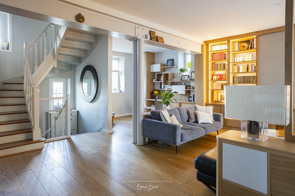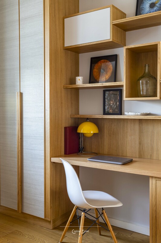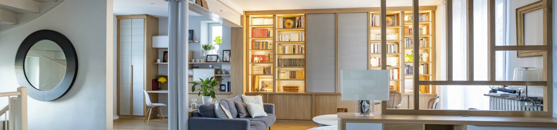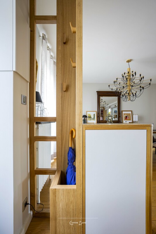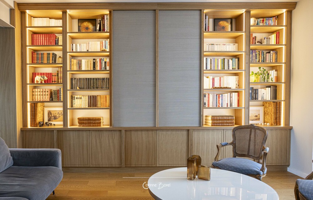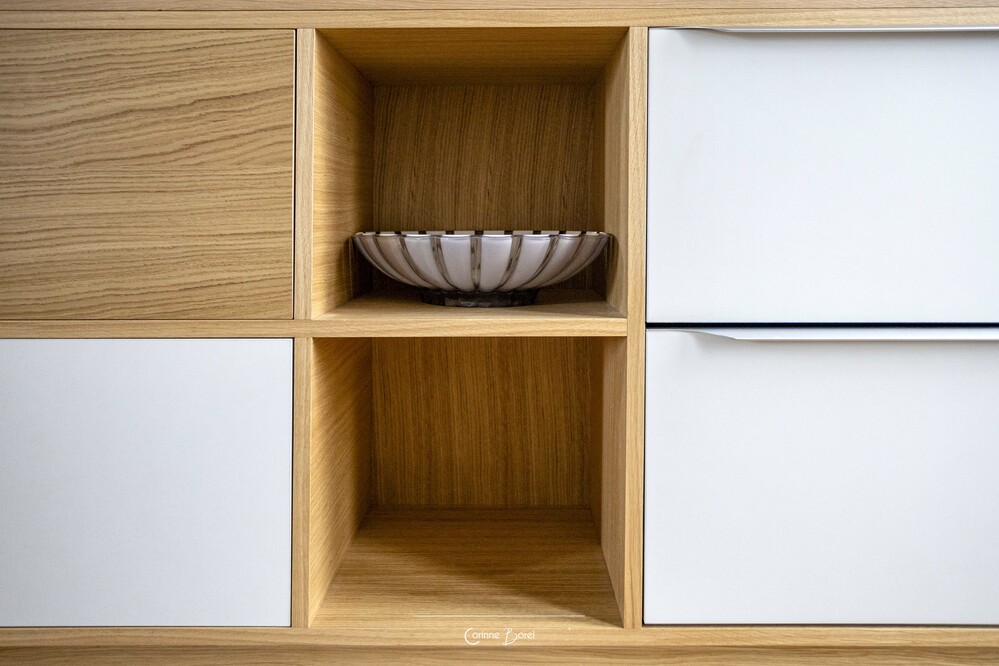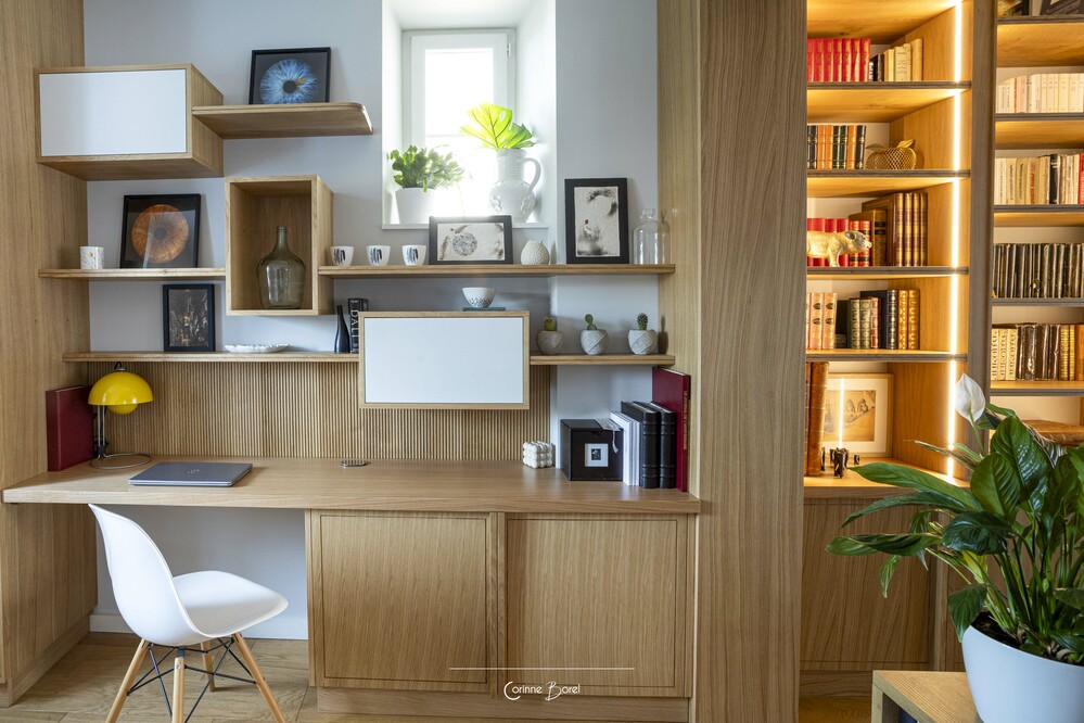 Réaménagement d'une pièce de vie Dans ce projet, les clients nous ont sollicités afin de structurer une grande pièce de vie ouverte, dépourvue de zones clairement définies. Leur souhait était d’intégrer des agencements sur mesure qui s’inscrivent naturellement dans l’architecture existante, comme s’ils faisaient partie intégrante des murs. Nous avons ainsi conçu une bibliothèque sur mesure, pensée comme un élément architectural à part entière. Dotée de portes coulissantes, elle permet de dissimuler la télévision tout en conservant une esthétique épurée et élégante. L’utilisation du chêne massif vient renforcer le caractère authentique et intemporel de l’ensemble. L’agencement TV se prolonge le long du mur afin de créer une continuité visuelle et fonctionnelle, donnant naissance à un espace bureau intégré. À l’entrée, deux agencements distincts viennent délimiter les volumes et structurer les circulations, tout en conservant une harmonie globale. L’ensemble des réalisations a été conçu en bois massif, mettant en valeur le savoir-faire artisanal et apportant chaleur, relief et élégance à l’espace. Menuisier : ATELIER JEREMY CRETOIS Photographe : Pascale Poujols |