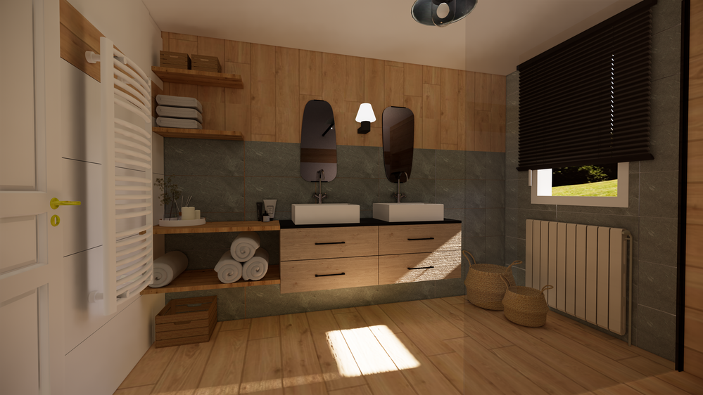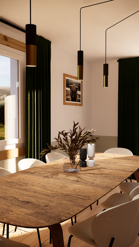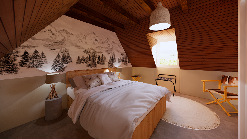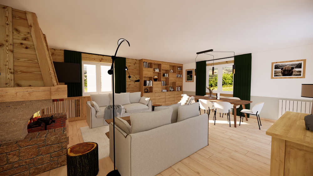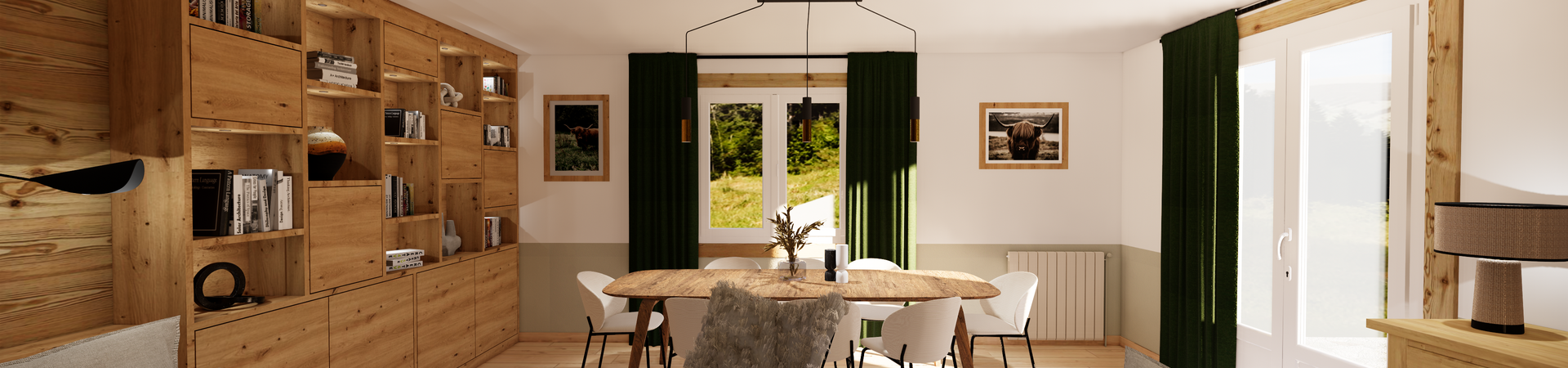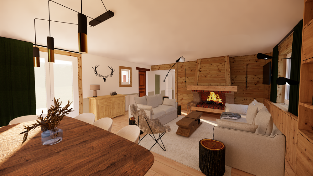 Le style « chalet de montagne » guide l’aménagement et la décoration, avec des agencements pensés pour optimiser l’espace, fluidifier la circulation et intégrer des rangements fonctionnels. Les revêtements ont été sélectionnés pour renforcer l’ambiance chaleureuse et l’identité du projet.